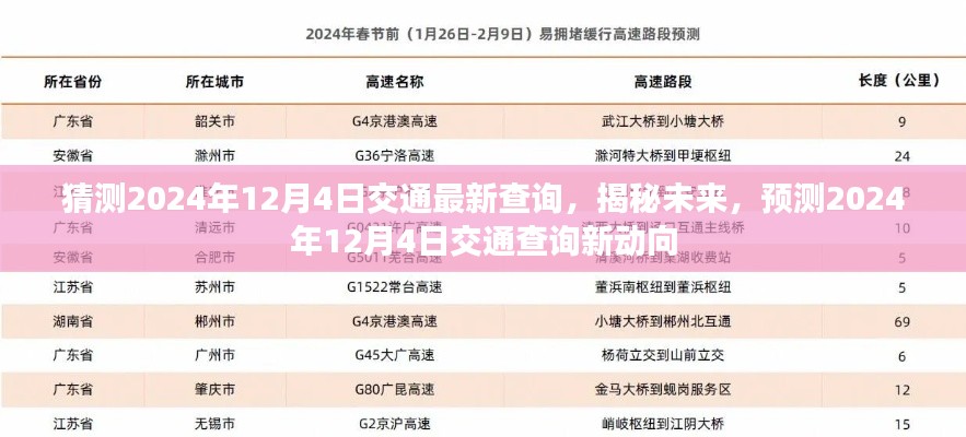 随着科技的飞速发展和城市化进程的加快,交通领域的变革日新月异,本文将围绕未来交通的发展趋势,特别是针对2024年12月4日的交通查询情况,进行一番猜测与探讨,我们将重点关注要点一:智能交通系统的普及与发展、要点二:绿色出行方式的崛起、以及要点三:个性化出行需求的满足与提升。
